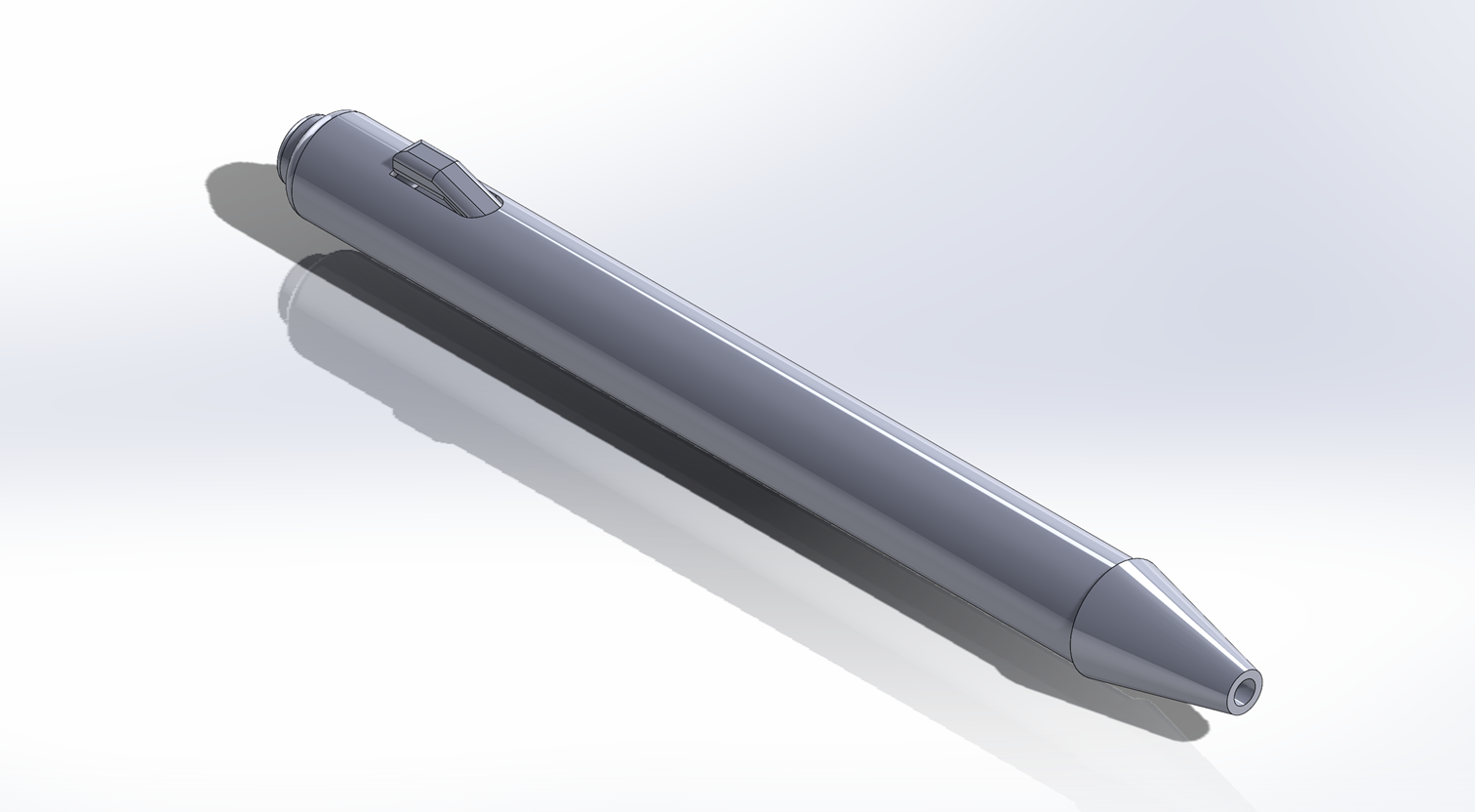 To model my pen, I used SolidWorks software. The pen is divided into three main components: the front tip, the button, and the complete assembled pen.